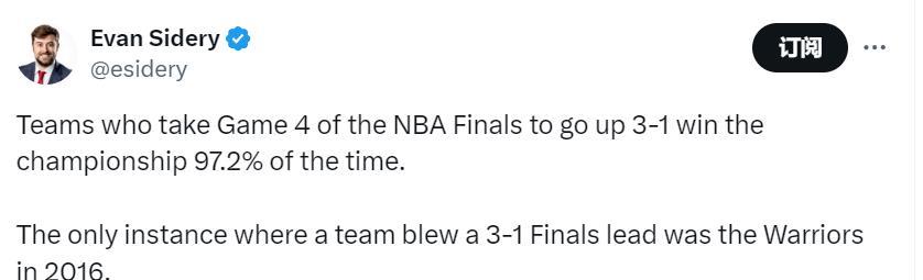 当然,雷霆要先争取拿下G4的胜利,将总比分扳成2-2平。毕竟,数据显示总决赛历史上1-3落后的球队,只有2016年的骑士成功翻盘,逆转勇士夺冠,而3-1领先的球队夺冠概率高达97.2%、