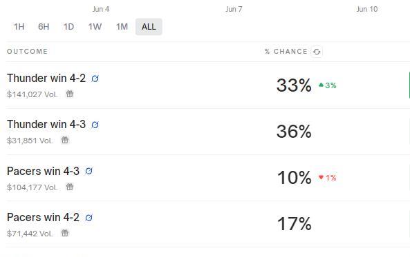 从目前的赔率来看,雷霆被看好翻盘夺冠,至于总比分,最被看好的是雷霆4 -3通过抢七夺冠(36%),第二被看好的比分是雷霆4-2夺冠(33%),随后依次是步行者4-2夺冠、步行者4-3夺冠和步行者4-1夺冠。